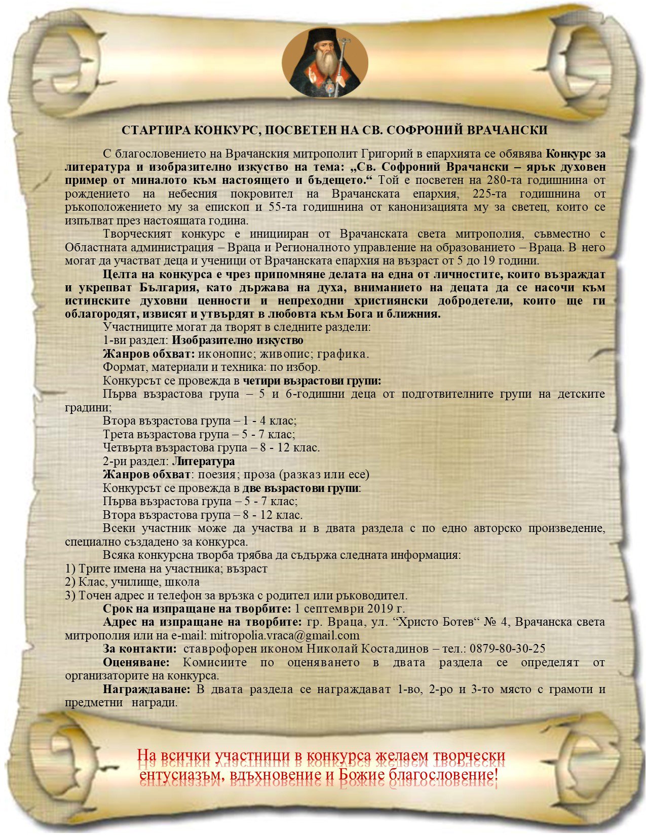От Врачанската света митрополия пожелават на всички участници в конкурса  творчески ентусиазъм, вдъхновение и Божие благословение!