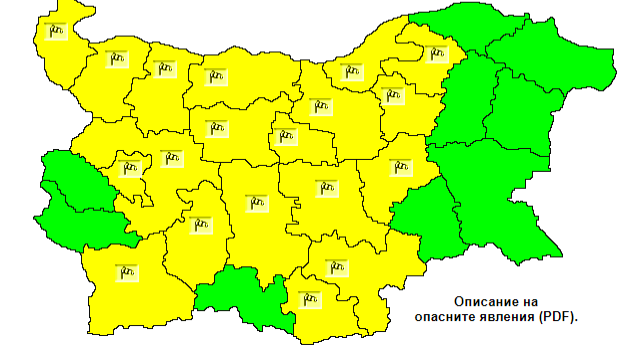 Предупреждението е валидно за областите Видин, Монтана, Враца, Плевен, Ловеч, Велико Търново, Габрово, Русе, Търговище, Разград, Сливен, Стара Загора, Хасково, Кърджали, Пловдив, Пазарджик, Благоевград, София-град и област София.