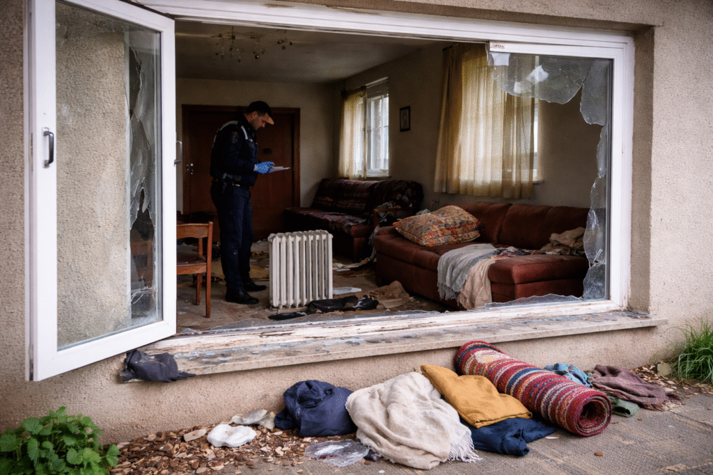При извършения оглед разследващите установили, че в жилището е проникнато след демонтиране на стъкло от прозорец. Откраднати са различни движими вещи от бита – два стола, радиатор, одеяла, килим, постелки и дрехи.