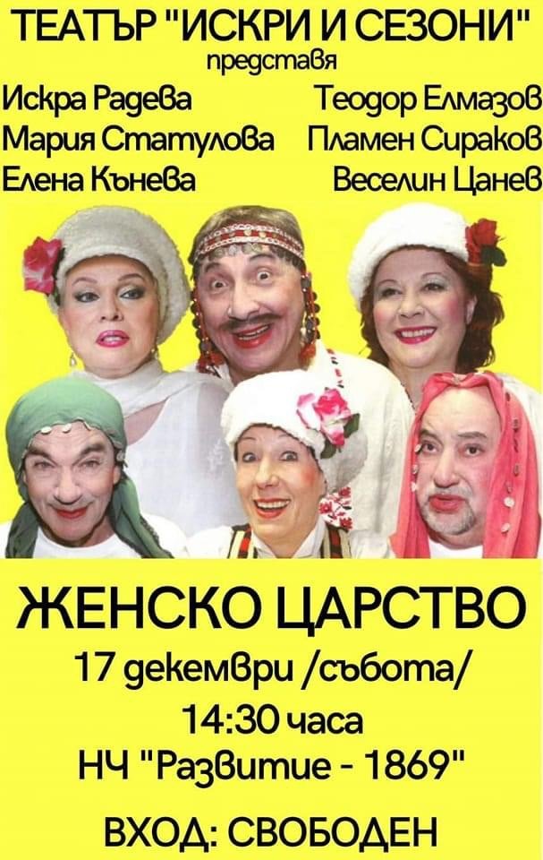 Комедията „Женско царство“ ще гостува на врачанската сцена на 17 декември /събота/, от 14:30 часа – в залата на Читалище „Развитие-1869“.
