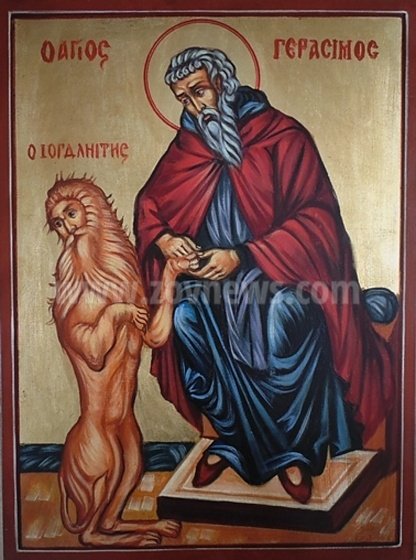 Случило се един ден да намери ранен лъв, когото излекувал и от онзи момент дивият звяр станал домашен любимец на преподобния Гарасим. Легендата разказва, че лъв с трън в лапата потърсил помощта на светеца. След като Герасим извадил тръна, лъвът останал негов дългогодишен спътник.
