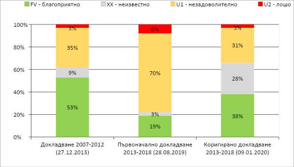 Фиг. 2 Разпределение на % оценки на видовете в хода на докладването от 2013 и 2019.