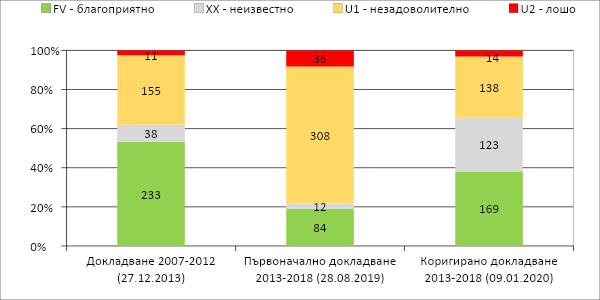 Фиг. 1 Разпределение на броя оценки на видовете в хода на докладването от 2013 и 2019 г.