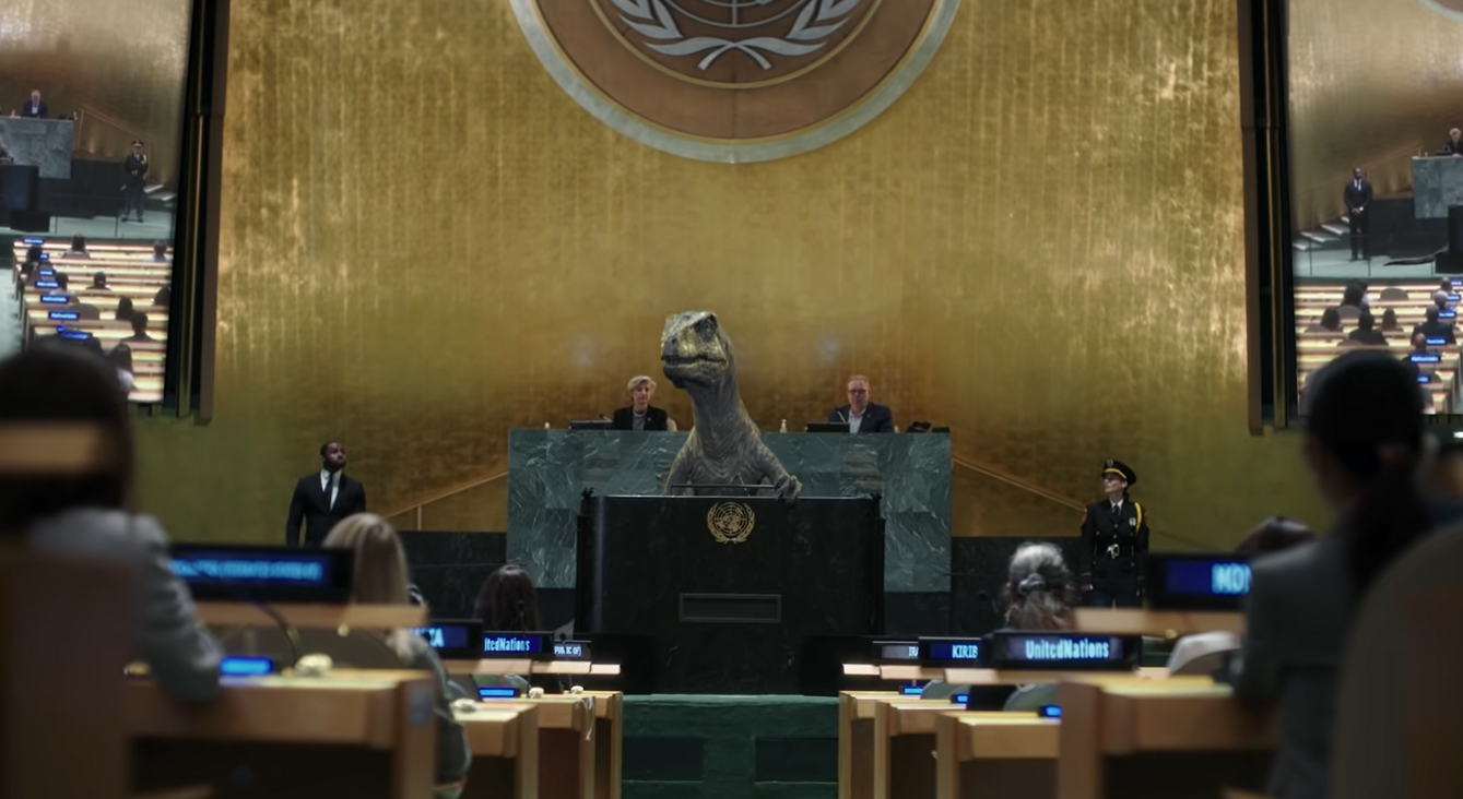 Триизмерен динозавър умолява човечеството да спаси вида си от трибуната на ООН.