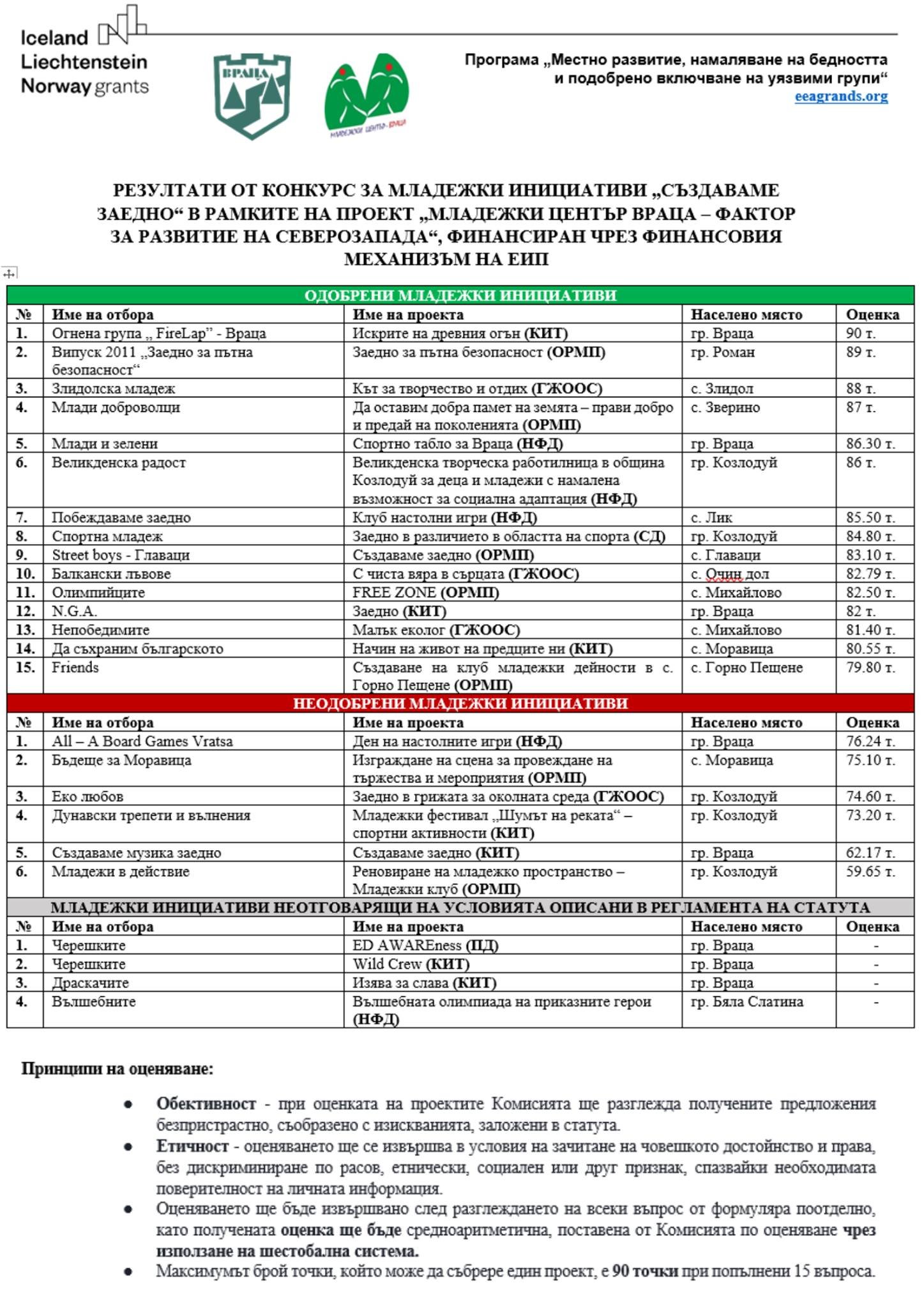 Първата инициатива, която ще получи подкрепа е „Великденска творческа работилница в община Козлодуй за деца и младежи с намалена възможност за социална адаптация“ на екип „Великденска радост“ – гр. Козлодуй, а втората одобрена инициатива е „Заедно в различието в областта на спорта“ на екип „Спортна младеж“ – гр. Козлодуй.