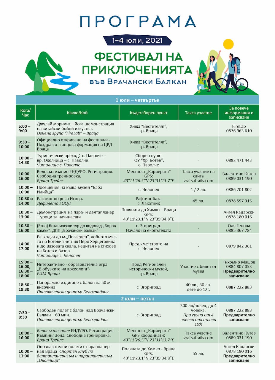 От 1 до 4 юли на територията на Враца и Природен парк „Врачански Балкан“ ще се проведе Фестивал на приключенията. Събитието е насочено както към любителите на екстремните спортове, така и към семейства с деца.