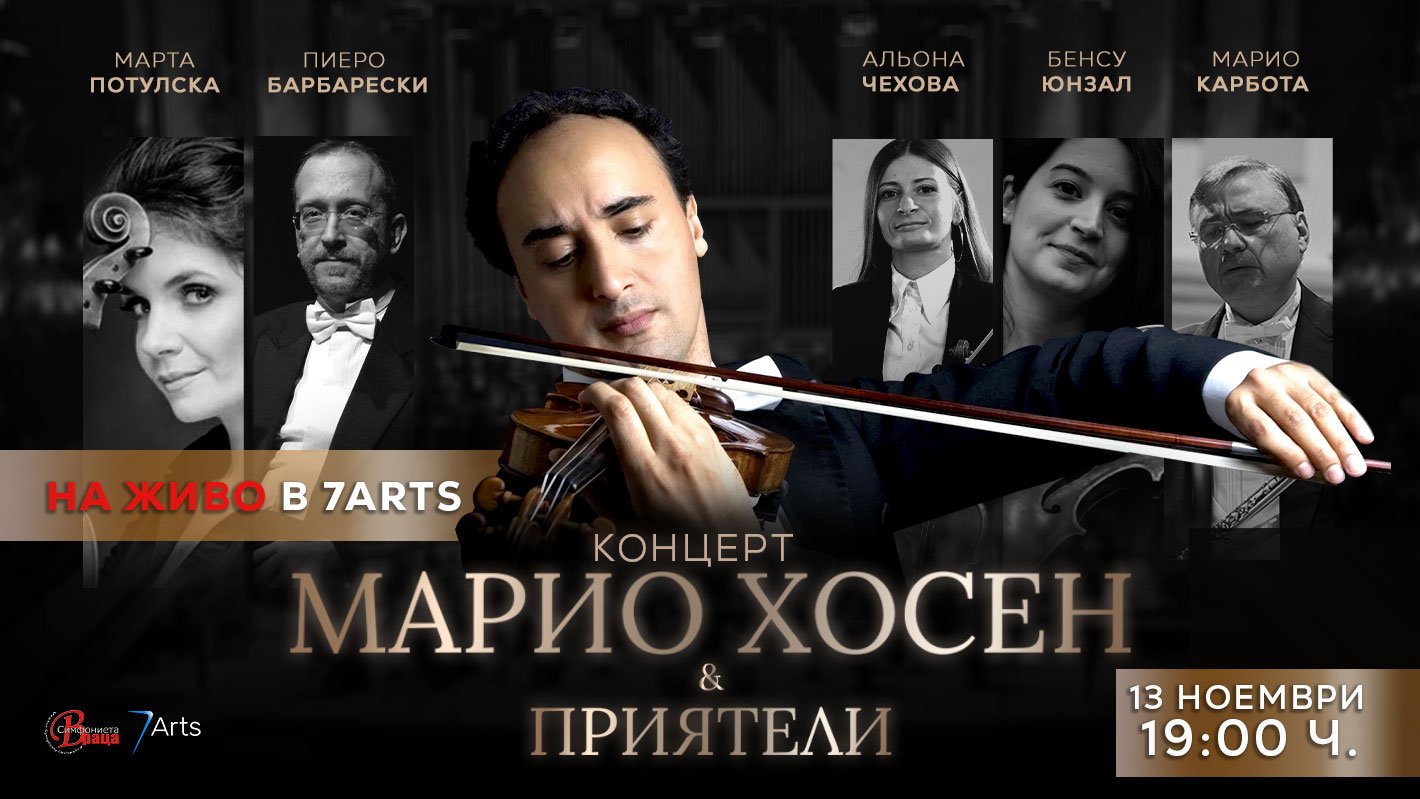 Ще имаме удоволствието да чуем цигуларя Марио Хосен в зведната компания на известни свои колеги и приятели, с които твори на редица сцени по света, заедно със Симфониета Враца и диригента Никола Петров. Солисти в концерта на 13 ноември от 19.00ч. са: ПИЕРО БАРБАРЕСКИ (пиано), МАРИО КАРБОТА (флейта), МАРТА ПОТУЛСКА (виола), БЕНСУ ЮНЗАЛ (цигулка), АЛЬОНА ЧЕХОВА (цигулка)