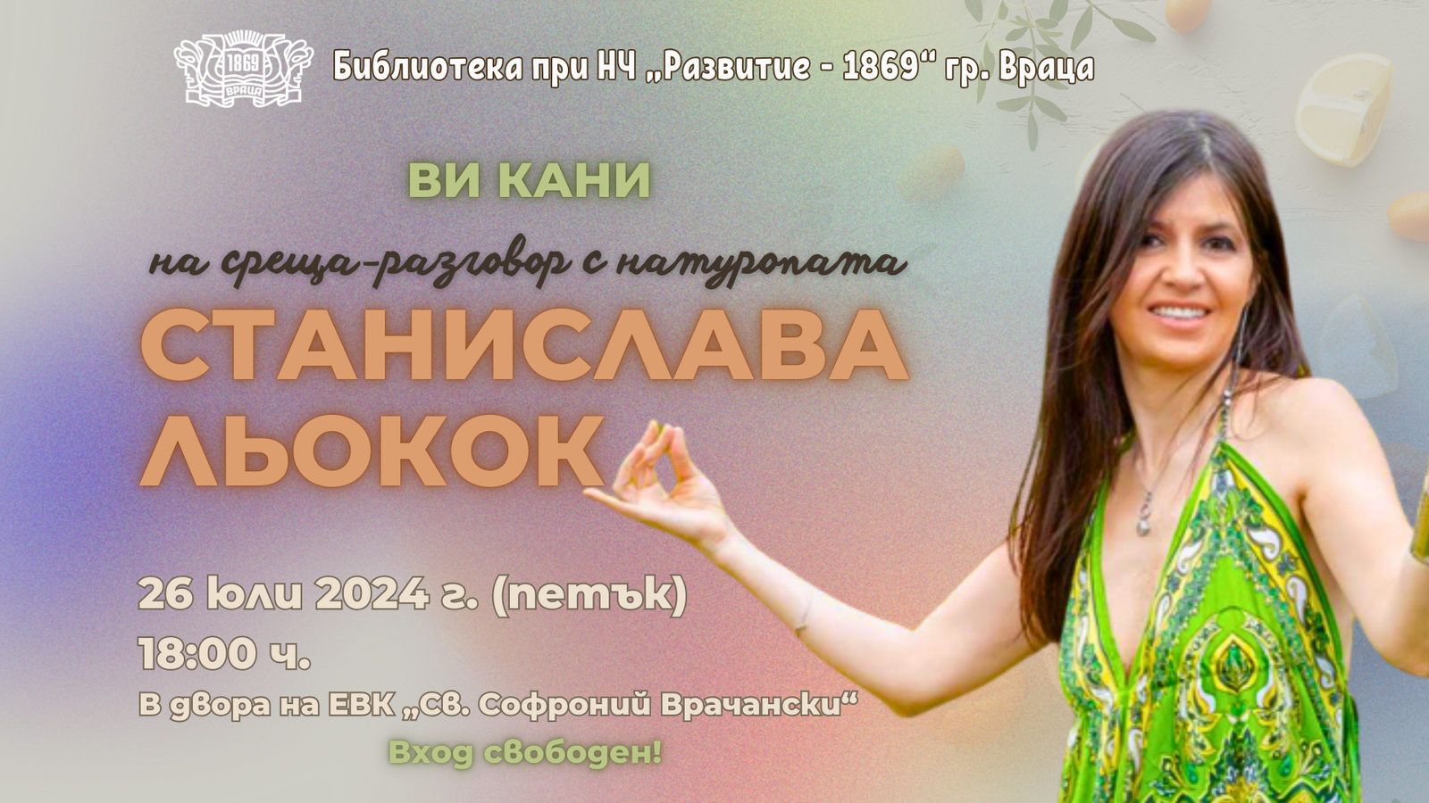 Библиотеката при Народно читалище „Развитие -1869“ гр. Враца Ви кани на среща-разговор с натуропата Станислава Льокок. Срещата ще се проведе на 26 юли (петък) 2024 г. от 18:00 ч. в двора на Етнографско-възрожденски комплекс „Св. Софроний Врачански“.