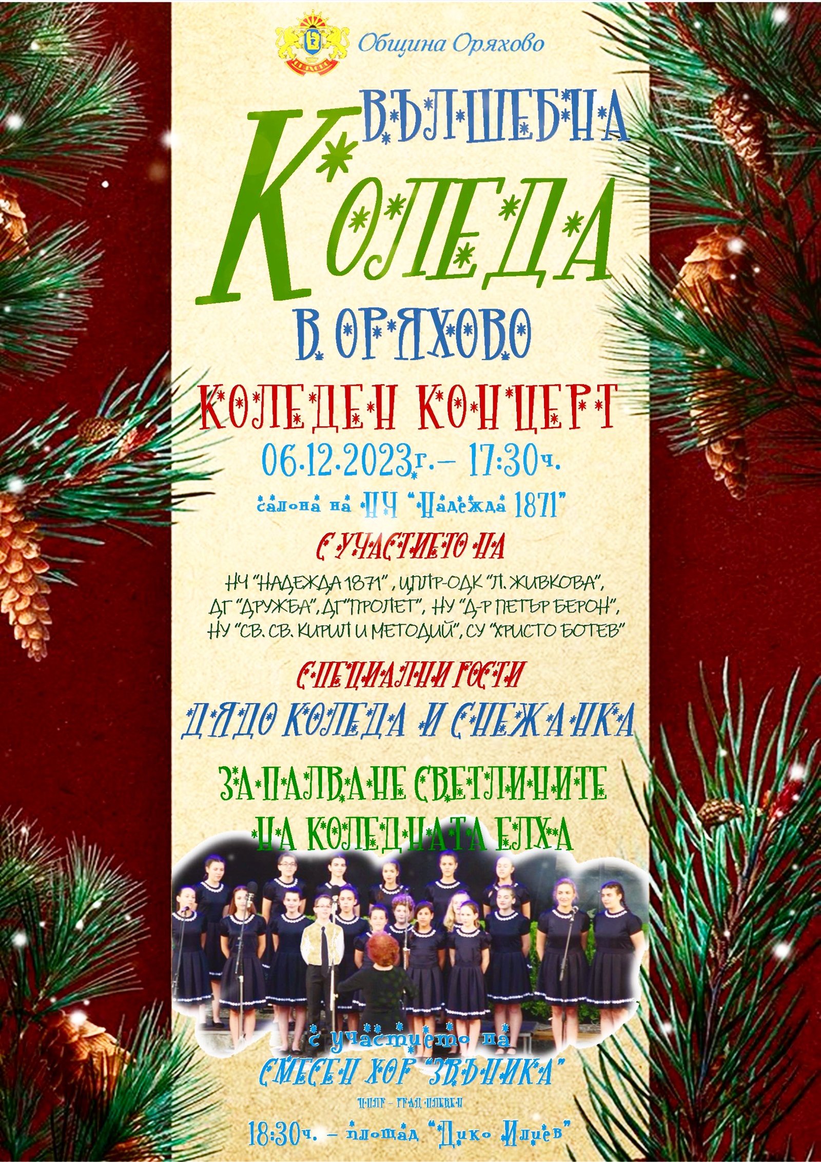 06.12.2023г. /сряда/ от 17:30ч. в салона на НЧ “Надежда 1871” – град Оряхово – “Вълшебна Коледа в Оряхово” – концерт с участието на образователни и културни институции .