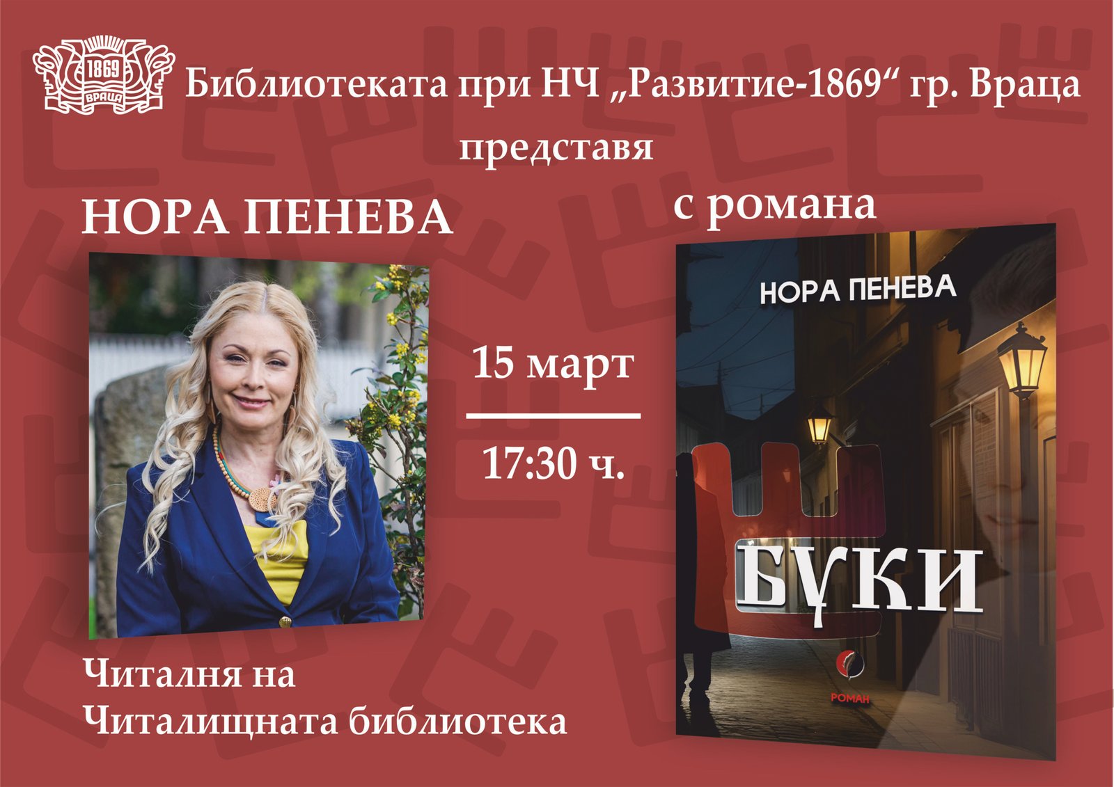 Библиотеката при НЧ „Развитие – 1869“ гр. Враца представя Нора Пенева и романа ѝ „Буки“. Срещата ще се състои на 15 март 2024 г. /петък/ от 17:30 ч. в читалнята на библиотеката.