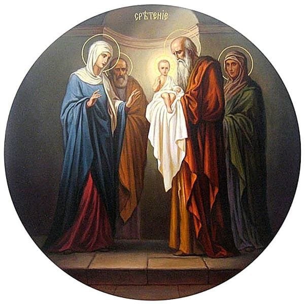 Посрещнал ги благочестивият старец Симеон (Богоприемец) с думите : ”Сега отпускаш Твоя раб, Владико, според думата Си с миром, защото очите ми видяха Твоето Спасение, което си приготвил пред лицето на всички народи – светлина за просвета на езичниците и слава на Твоя народ Израиля!“
