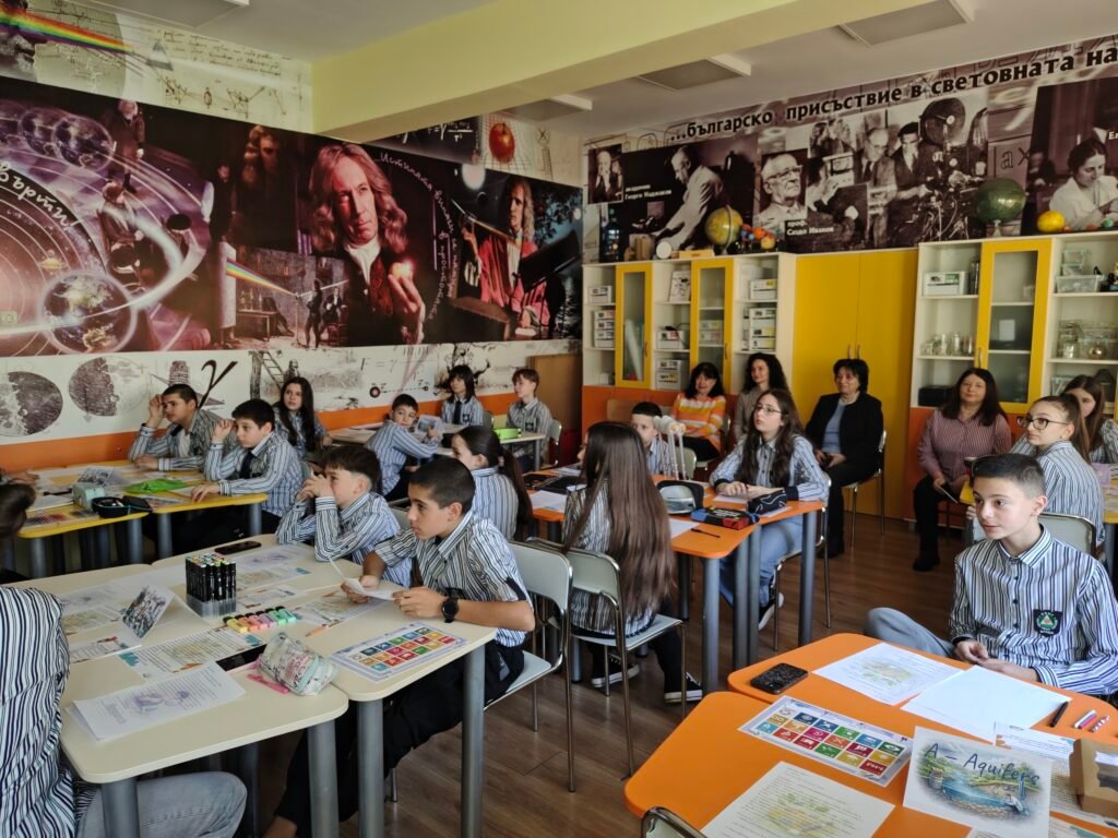 Занятието беше подготвено от Пепа Павлова, старши учител по физика и астрономия и координатор на проект „Еразъм+“, и Ивалина Райкова, старши учител по биология и здравно образование. По време на урока учениците проследиха символично пътя на една капка вода и разгледаха връзките между природните процеси, производството на енергия и научните методи за опазване на водата.