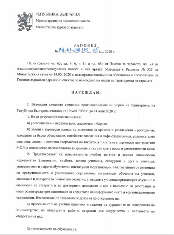 I. Въвеждам следните временни противоепидемични мерки на територията на Република България, считано от 19 май 2020 година до 14 юни 2020 година: