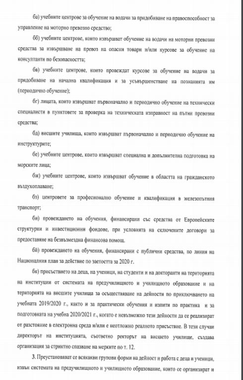 1. Преустановяват се присъствените учебни занятия и всички извънкласни мероприятия (занимални, клубове, зелени училища, екскурзии и др.) в училища, университетите и в други обучителни институции и организации. Институциите от системата на предучилищното и училищното образование организират обучение на ученици, оценяване и подкрепа на личностното развитие, а висшите училища организират обучение и оценяване на студенти и докторанти доколкото и ако е възможно от разстояние в електронна среда чрез използване на средства на информационните и комуникационните технологии. Изключение от забраната се допуска по отношение на: