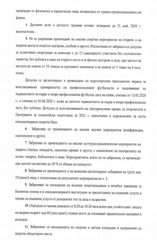 Допуска се организиране и провеждане на подготвителен триседмичен период за възстановяване тренираността на професионалните футболисти и подновяване на първенството за първа и втора професионална футболна лига на етапи, считано от 15.05.2020г, а считано от 5.06.2020г. може да започне първенството за първа и втора професионална лига, без публика. Допуска се възстановяването на тренировъчния процес за спортистите в Програмата за олимпийска подготовка за 2021 година единствено в определените за целта специализирани спортни бази.