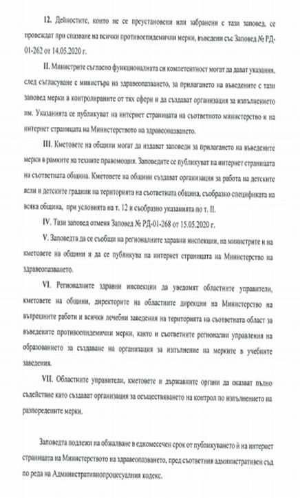 7. Дейностите, които не са преустановени или забранени с тази заповед, се провеждат при спазване на всички противоепидемични мерки, въведени със Заповед № РД-01-262 от 14.05.2020г.