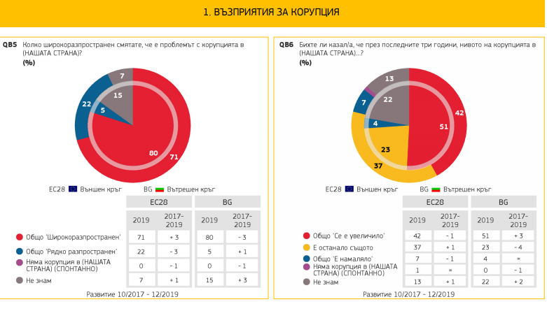 80% от българите са на мнение, че проблемът с корупцията в страната е широкоразпространен. Това показва проучването на ЕК „Евробарометър“, според което българите са сериозно засегнати от корупцията и смятат, че подкупите и злоупотребата с власт са широкоразпространени в националните и регионални институции.