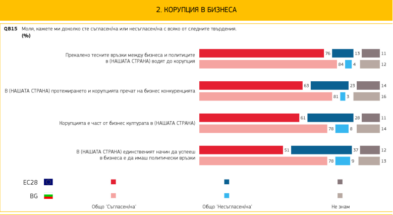 По отношение на корупционните практики в бизнеса, 76% от българите са на мнение, че прекалено тесните връзки на бизнеса с политиците неизменно водят до корупция.