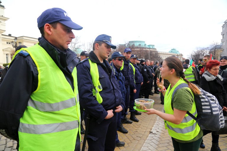 Първоначално полицаите, които охраняват демонстрацията, призовали хората да се оттеглят от пътното платно. Протестиращите обаче не го направили и това принудило униформените да употребят сила. Групата била изтласкана към паметника на „Цар Освободител“. Малко по-късно пък протестиращите променили мотото си и освен оставката на правителството поискали и по-високи заплати за полицаите, твърди news.bg. След това шествието се насочило към сградата на Министерски съвет.