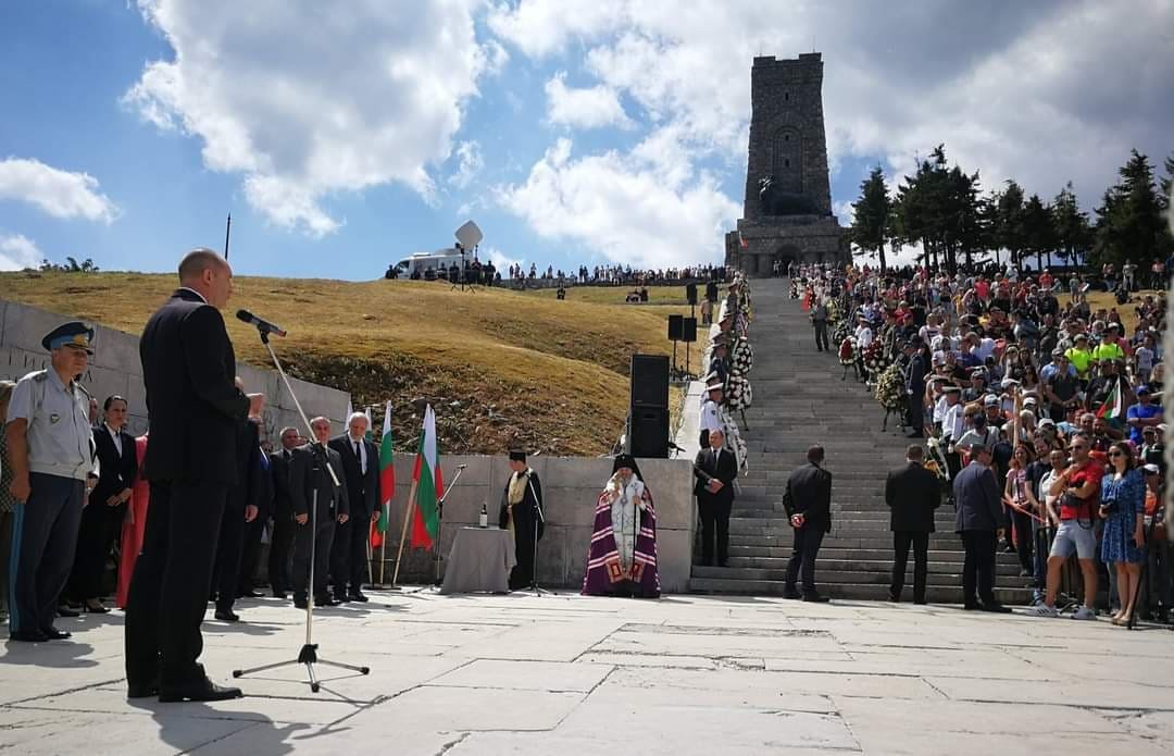 „Шипка е чутовен подвиг на българските опълченци и на руските войни, които заедно отстояха прохода. Онази врата, през която влезе българската свобода. Но Шипка е и символ на онази битка, която всеки българин, без оглед на възраст, етнос и религия, води дълбоко в сърцето си. Битката между страха и смелостта, между малодушието и доблестта, между егоизма и родолюбието, в която се решава личното ни и националното ни бъдеще. Нямам грам съмнение, че всички ние, заедно, с общи усилия и солидарност ще победим страха, колебанието, унинието, за да може да просперира България. Защото никой не може и няма сила, която да спре осъзнатите хора по пътя към свободата“, каза президентът.