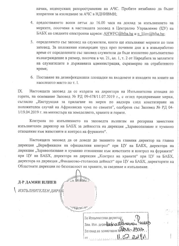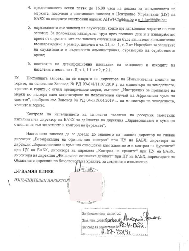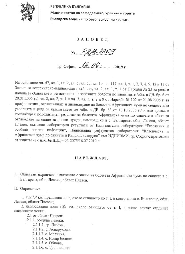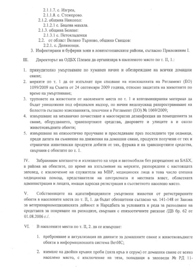 Животните от огнищната и предпазната зона ще бъдат умъртвени, а тези от наблюдаваната зона – преброени, става ясно от заповедта.