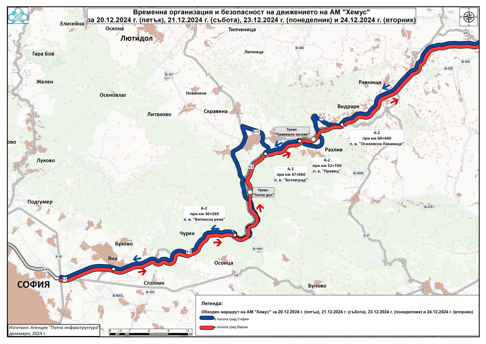 На 20 декември /петък/, 21 декември /събота/, 23 декември /понеделник/ и 24 декември /вторник/ в тунелите „Топли дол“ и „Правешки ханове“ ще има две ленти в посока Варна. Трафикът за София ще бъде пренасочен по обходен маршрут. От 47-ми км на АМ „Хемус“ при пътен възел „Ботевград“ шофьорите ще преминават по път II-17, по път I-1 София – Ботевград и при 30-ти км на автомагистралата при п. в. „Витинска река“ ще продължават пътуването си по АМ „Хемус“. Трафикът към София в района на тунел „Правешки ханове“ от пътен възел „Осиковска Лакавица“ ще преминава по път I-3 Ябланица – Ботевград и при пътен възел „Правец“ ще се връща на АМ „Хемус“.