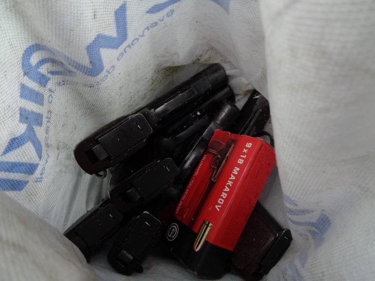 Там е намерено и иззето голямо количество огнестрелни оръжия – над 20 пистолета със заличени фабрични номера, 50 пълнителя и 2000 боеприпаса за тях, картечни пистолети, автомати, заглушители, както и множество части и механизми за различни оръжия.