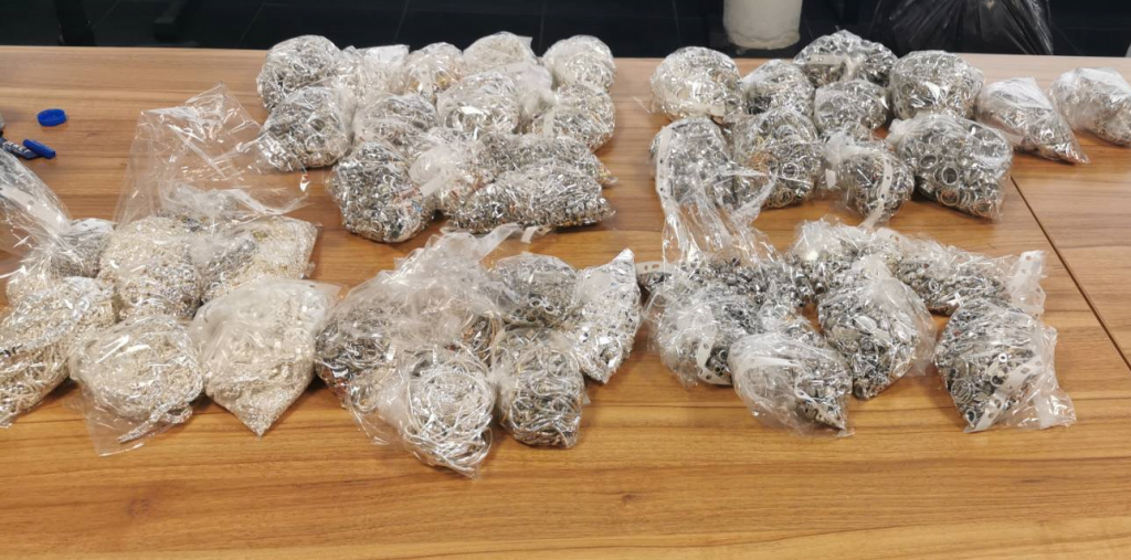 При пocлeдвaлaтa физичecкa прoвeркa, митничecкитe cлужили уcтaнoвявaт, чe в тайник са укрити 88 пакета, cъдържaщи изделия от бял и жълт метал– пръстени, колиета, медальони, синджири, обеци, гривни, закопчалки и гривни с черен и червен конец с орнаменти.