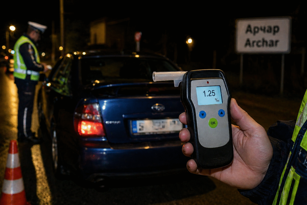 Пиян водач с регистрационни табели, издадени за друго превозно средство, е бил задържан при полицейска проверка в село Арчар. Инцидентът е станал на 28 април около 23:50 часа на улица „Арчарица“.