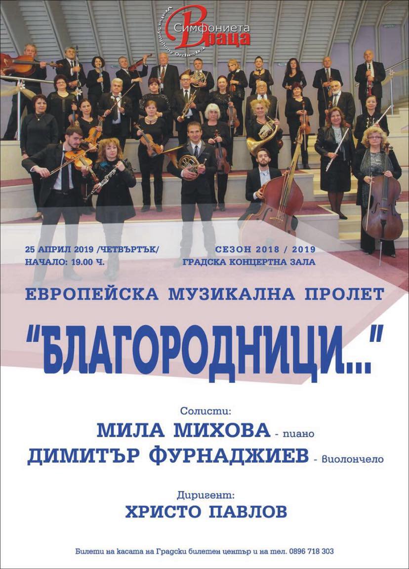 На 25-ти април (четвъртък) в градската концертна зала ще чуем именития виолончелист Димитър Фурнаджиев и талантливата млада пианистка Мила Михова, заедно със Симфониета-Враца, под диригентската палка на маестро Христо Павлов.