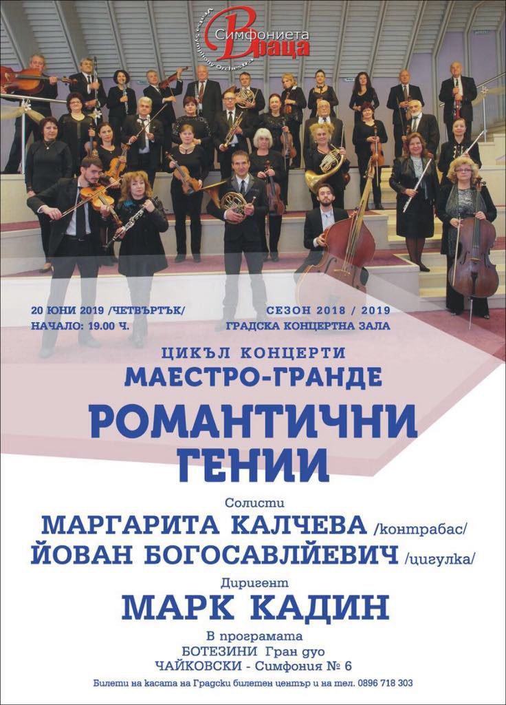 В програмата на концерта  „Романтични гении“ на 20-ти юни в градската концертна зала са включени: Ботезини – Ганд Дуо и Чайковски – Симфония №6.