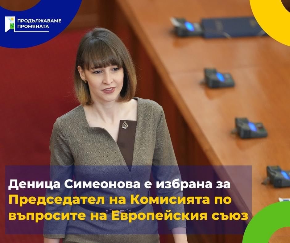 Народният представител от „Продължаваме Промяната“ маг. инж. Деница Симеонова бе избрана за председател на парламентарната Комисия по въпросите на Европейския съюз.