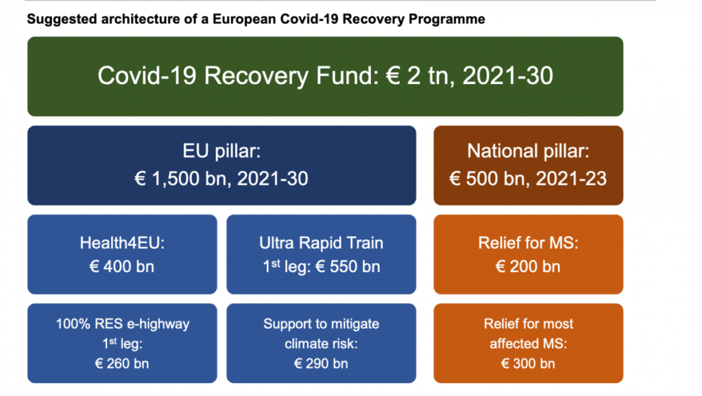 Въпреки че фондът от 500 милиарда евро е противоречив, европейски икономисти настояват за много по-напреднали стъпки. Дюселдорфският институт за макроикономика, Австрийският икономически институт WIIW и френският институт OFCE призовават в съвместен анализ Европа да отдели общо два трилиона евро за европейска инвестиционна програма, за да се справи с причинената от коронавируса криза.