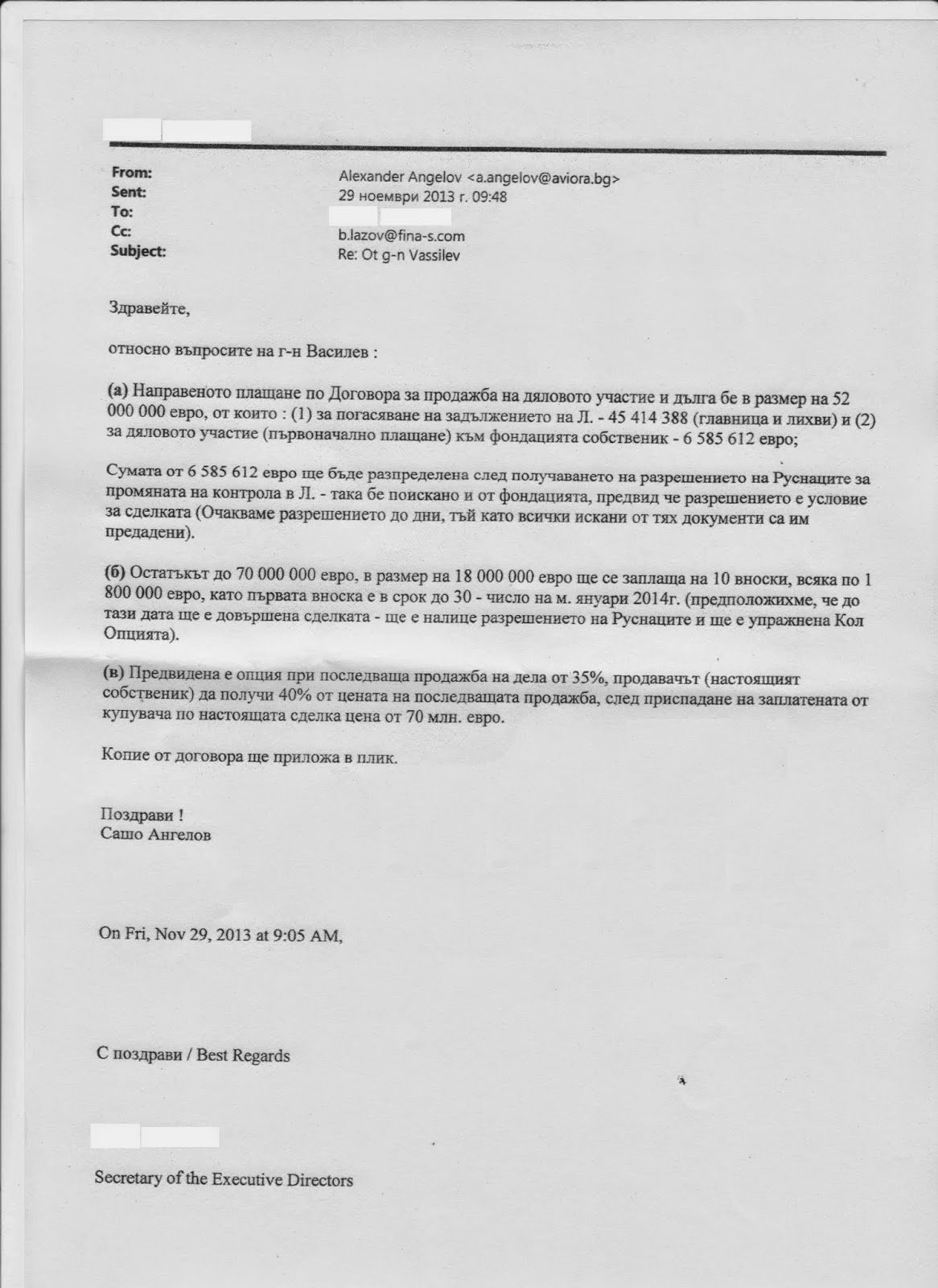 Според източник, участвал в конструирането на сделката, зад Sedona стоят интересите на голям български производител на алкохол и цигари, базиран в Пловдив. Реален държател на правата в Panim е трябвало да бъдат Ирена Кръстева и Цветан Василев. Атаката на Пеевски по Василев е имала измеримост и в това, че банкерът е загубил каквато и да е възможност да контролира Panim и то е останало изцяло в ръцете на майката на Пеевски. Според теклата между адвоката на Пеевски Александър Ангелов и Бисер Лазов комуникация, мажоритарния собственик на КТБ Цветан Василев е трябвало да преведе 70 млн. евро като част от сделката по преструктуриране. В писмото си Ангелов обяснява какво „се е случило“ с парите. Не става ясно обаче дали тези пари, които да получени в контролираната от майката на Делян Пеевски фондация са декларирани. Обявила ли е Кръстева получаването на 70 млн. евро? Къде, кога и какъв данък е платен върху тях? и те ли са част от средствата, използвани от Пеевски да покаже пред НАП и прокуратура, че няма разминаване в доходите му и начина му на живот?*