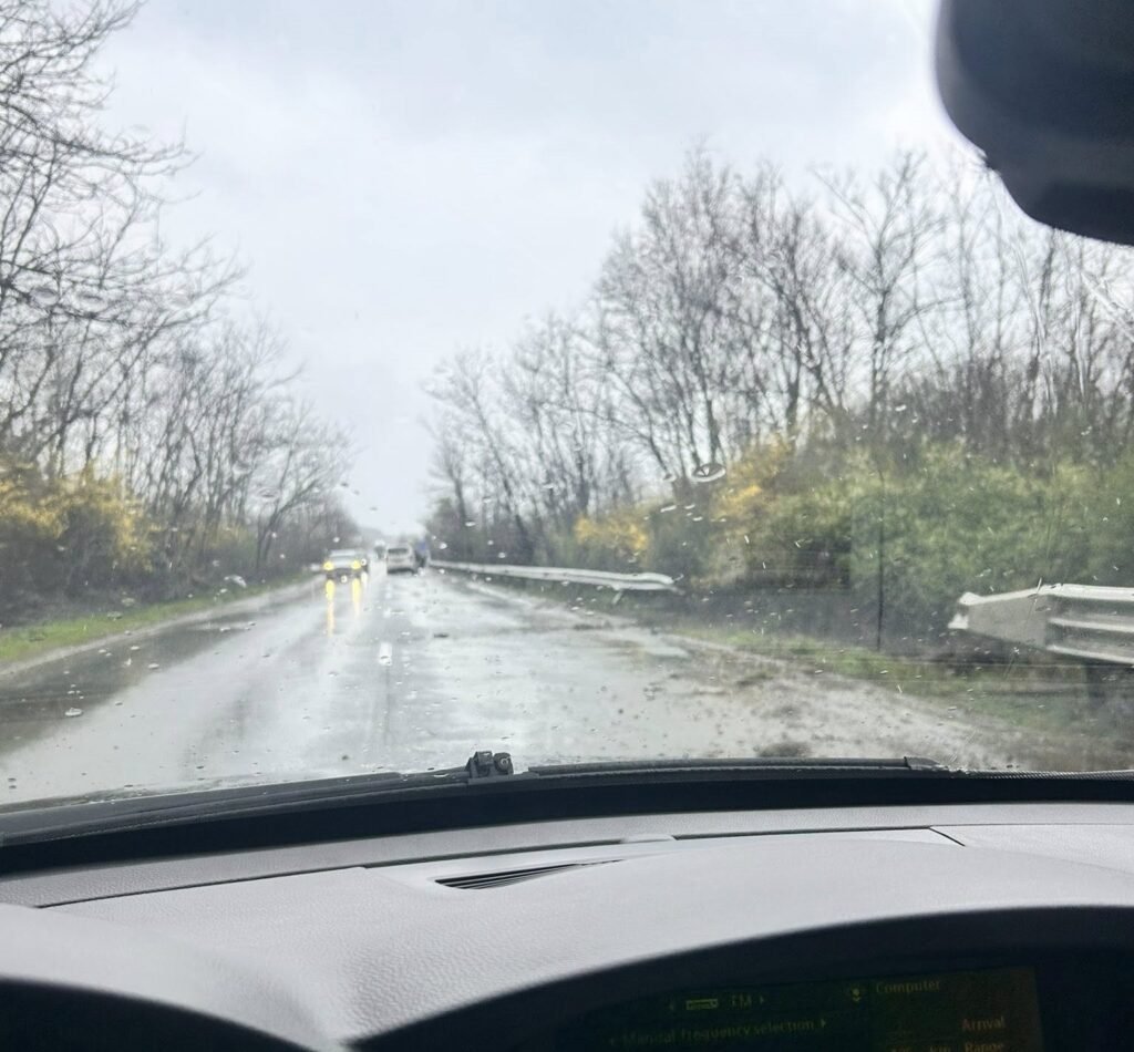 Инцидентът е възникнал при неблагоприятни метеорологични условия – мокра настилка, валежи и намалена видимост. Освен това по пътя се наблюдават и големи дупки, които допълнително затрудняват преминаването и създават предпоставки за подобни инциденти.
