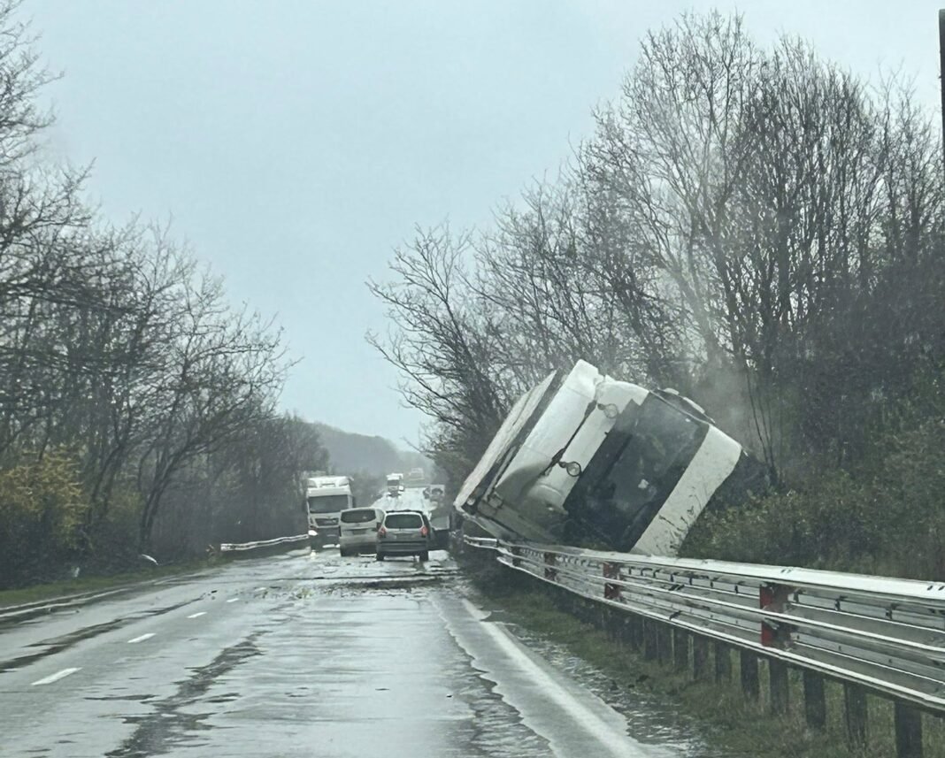 От публикуваните снимки се вижда, че тежкотоварен камион е напуснал пътното платно и се е качил върху мантинелата, като кабината му е силно наклонена встрани. Част от превозното средство остава извън пътя, а ситуацията създава сериозен риск за останалите участници в движението.