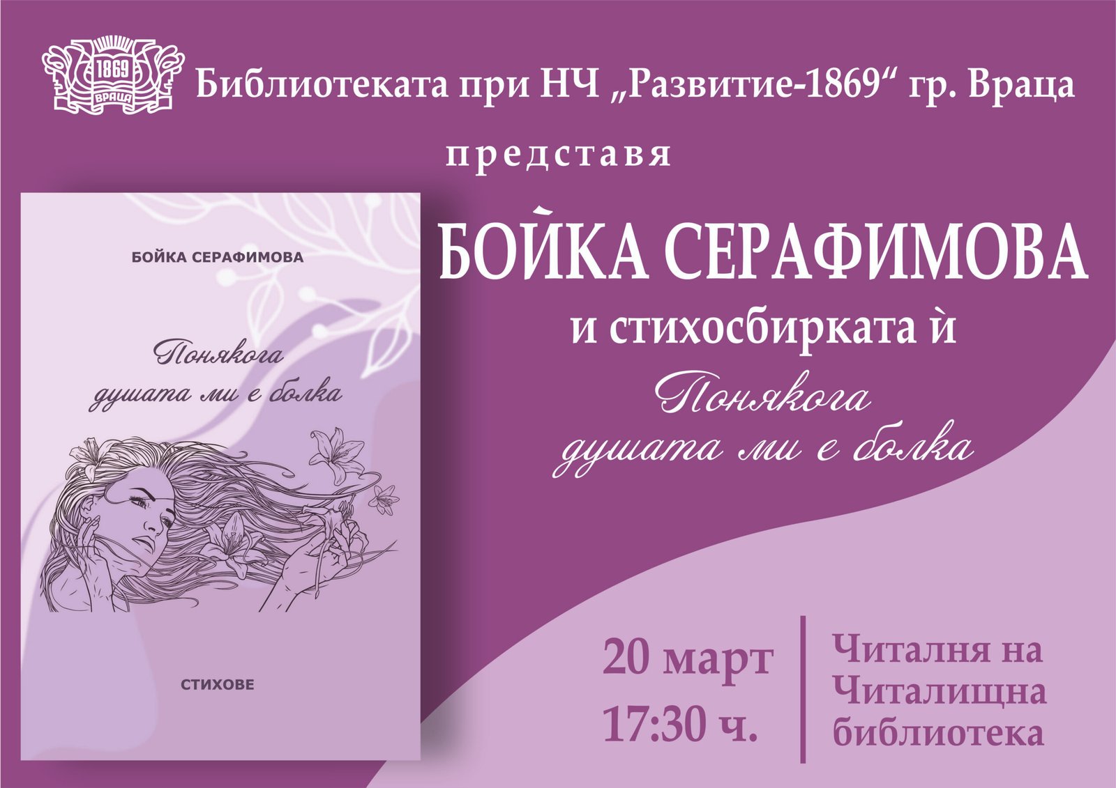 Библиотеката при НЧ „Развитие – 1869“ гр. Враца представя Бойка Серафимова и стихосбирката „Понякога душата ми е болка“. Срещата ще се състои на 20 март 2024 г. /сряда/ от 17:30 ч. в читалнята на библиотеката.