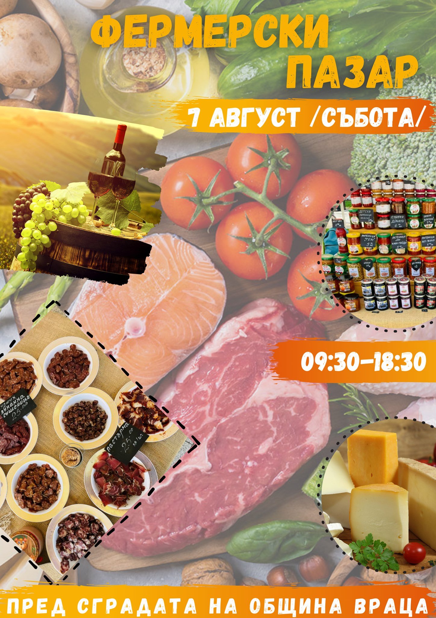 Фермерският пазар ще се проведе на 7 август /събота/, от 09:30 до 18:30 часа, пред сградата на Община Враца.
