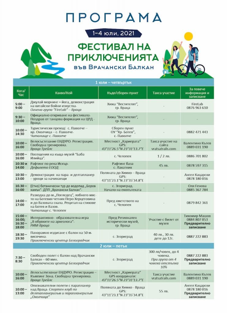 От 1 до 4 юли на територията на Враца и Природен парк „Врачански Балкан“ ще се проведе Фестивал на приключенията. Събитието е насочено както към любителите на екстремните спортове, така и към семейства с деца.