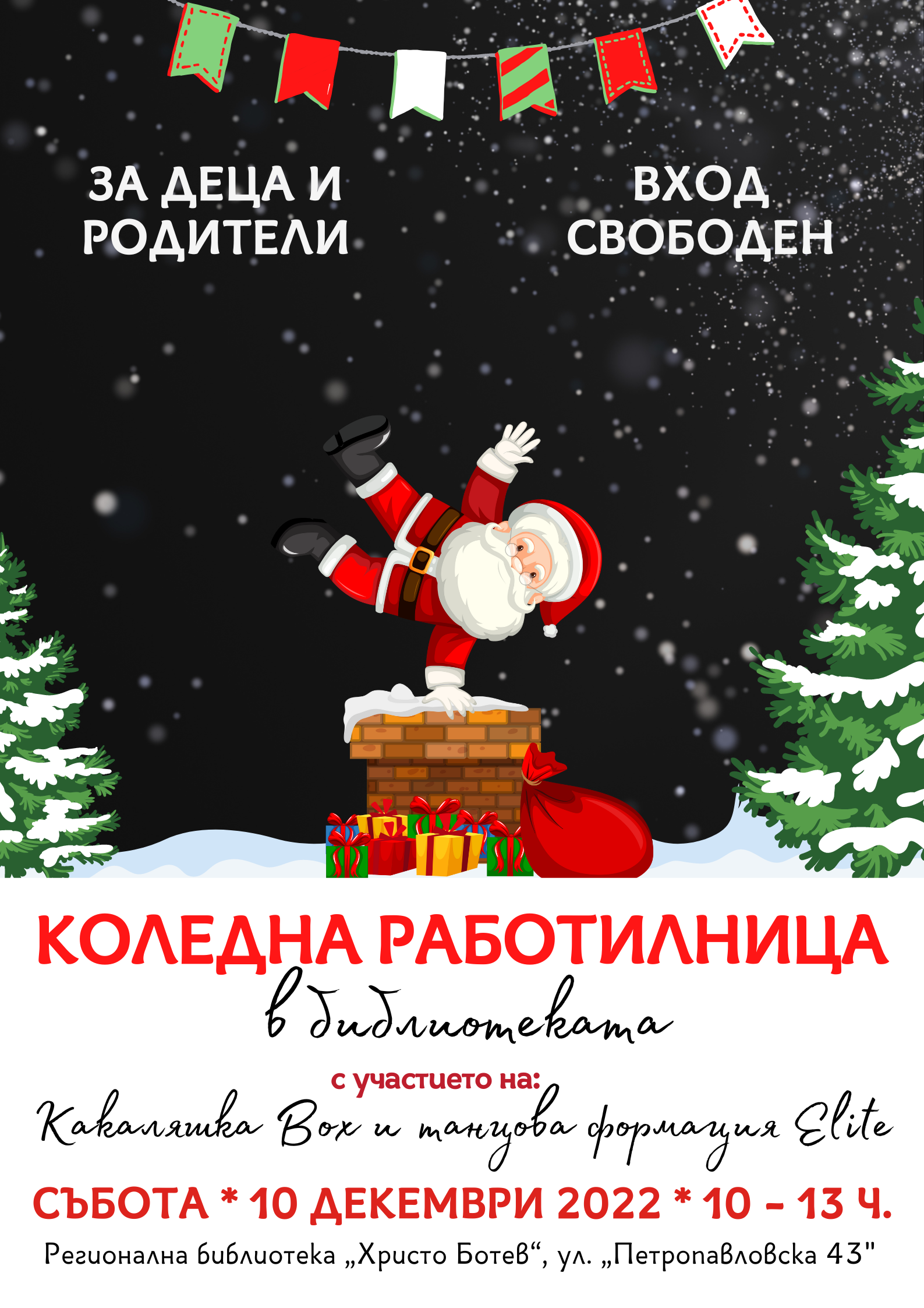 С помощта на ценните насоки, които ще дадат майсторите на вълната от Какаляшка Box, децата и техните родители ще могат да си изработят коледни топки, снежинки, елхички и всякакви украшения от естествени материали. За финал ще прочетем приказка за вълшебства и сбъднати желания.