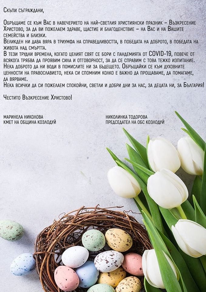 Обръщаме се към вас в навечерието на най-светлия християнски празник – Възкресение Христово, за да ви пожелаем здраве, щастие и благоденствие – на вас и на вашите семейства и близки.