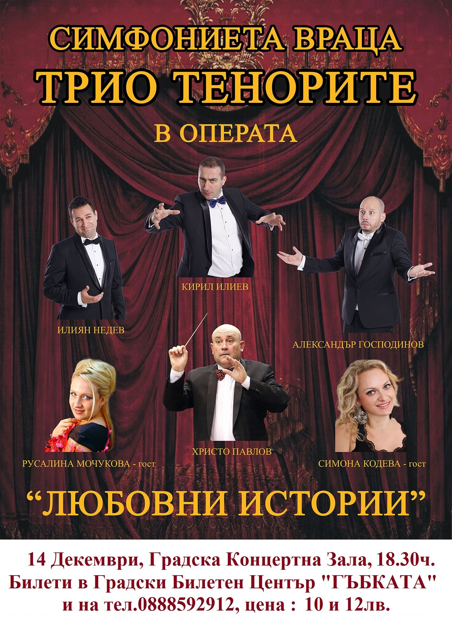 На 14-ти декември градската концертна зала ще се превърне в сцена за популярни оперни шедьоври, представени от любимците на врачанската публика – Трио Тенорите, гостуващите сопрани – Симона Кодева, Русалина Мочукова и Симфониета Враца с диригент Христо Павлов.
