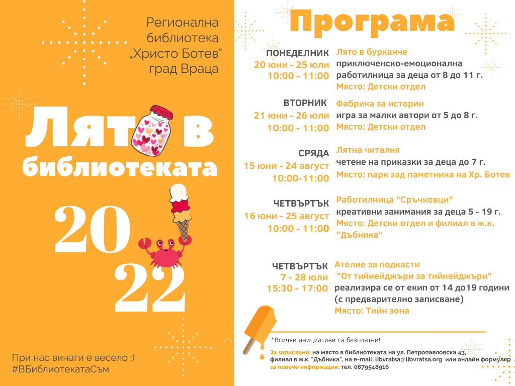 *За записване: на място в библиотеката на ул. Петропавловска № 43, филиал в ж.к. „Дъбника”, на e-mail: libvratsa@libvratsa.org