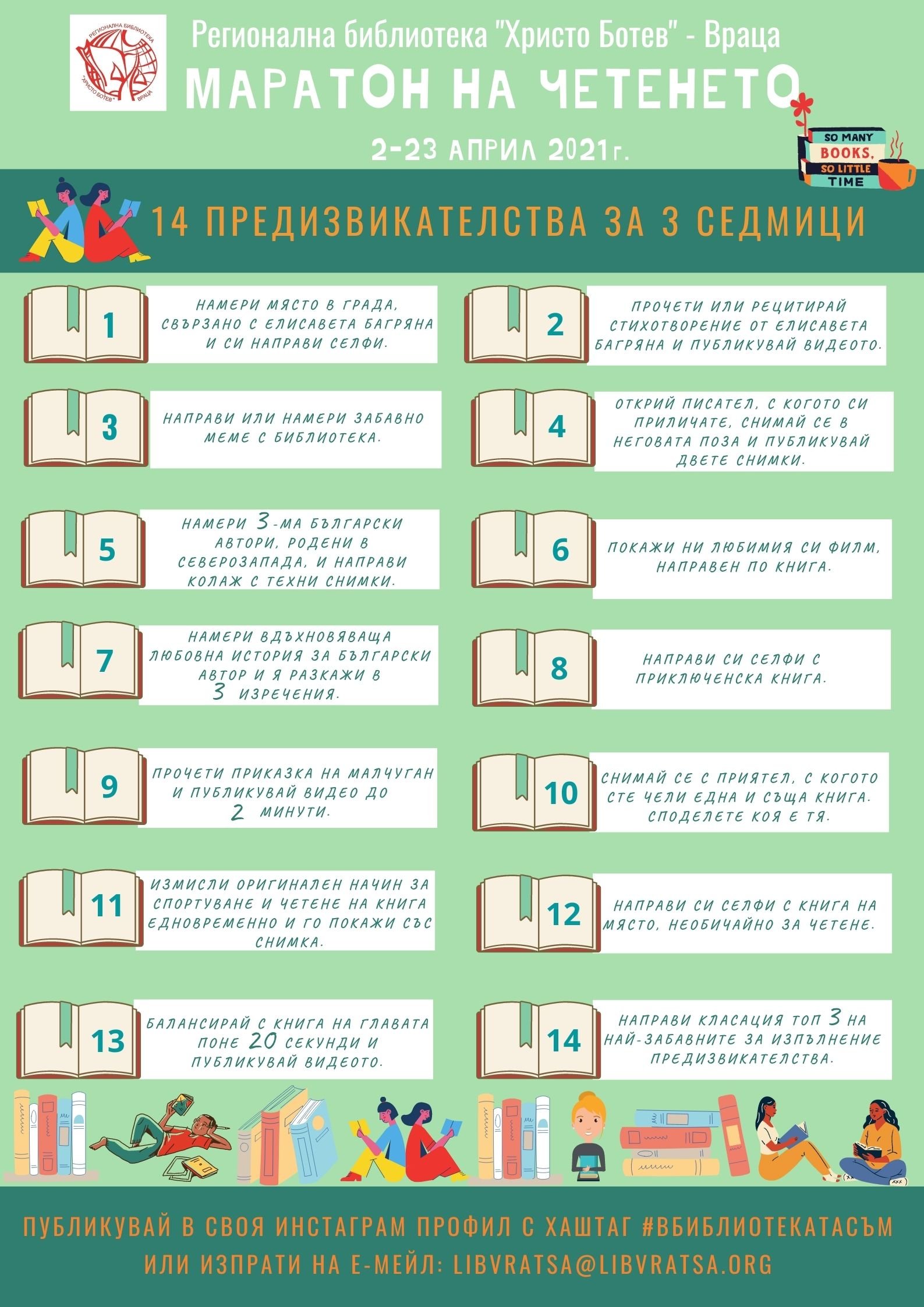 „Измисли оригинален начин за спортуване и четене на книга едновременно и го покажи със снимка“ – това е само едно от 14-те предизвикателства, които Регионална библиотека „Христо Ботев“ – Враца отправя към младежите от града в рамките на националната кампания „Маратон на четенето“.