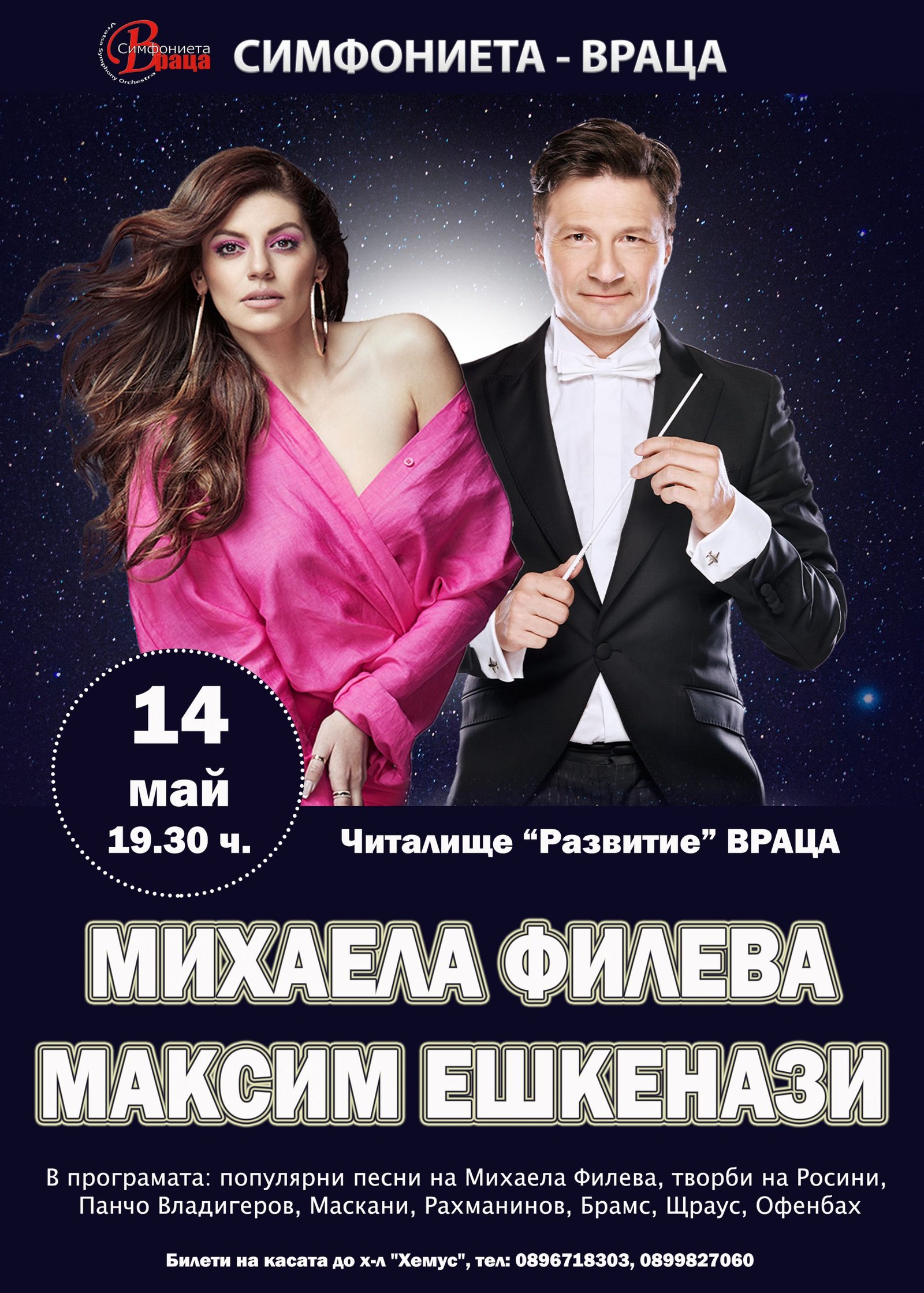 Диригентът Максим Ешкенази се завръща на врачанска сцена, заедно с харизматичната певица Михаела Филева, на 14-ти май от 19.30ч. в Читалище „Развитие“.