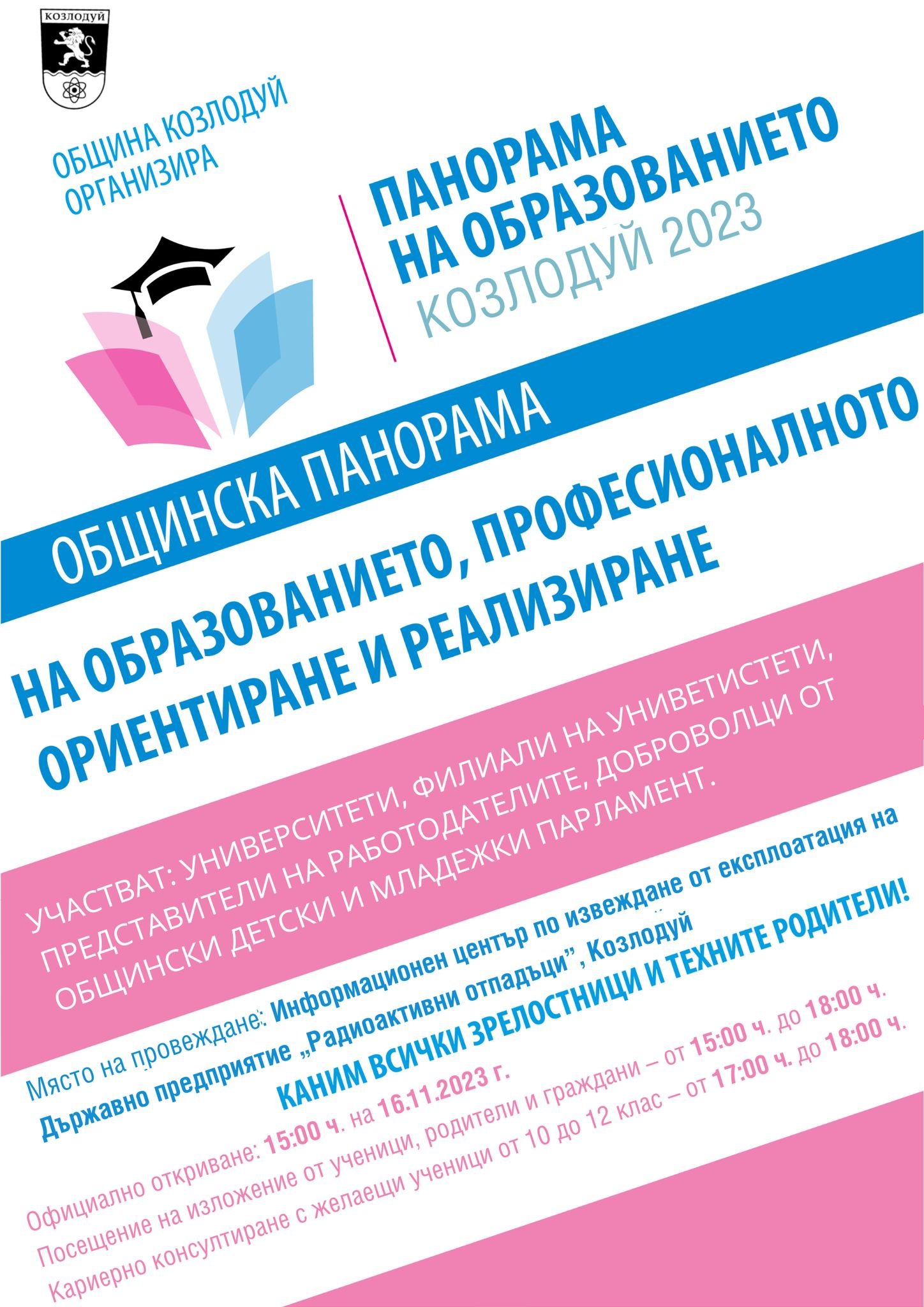 Предстои провеждането на Общинска Панорама на образованието, професионалното ориентиране и реализиране, която ще се проведе на 16 ноември, от 15:00 ч. до 18:00 ч., в Информационен център по извеждане от експлоатация на Държавно предприятие „Радиоактивни отпадъци”, гр. Козлодуй.