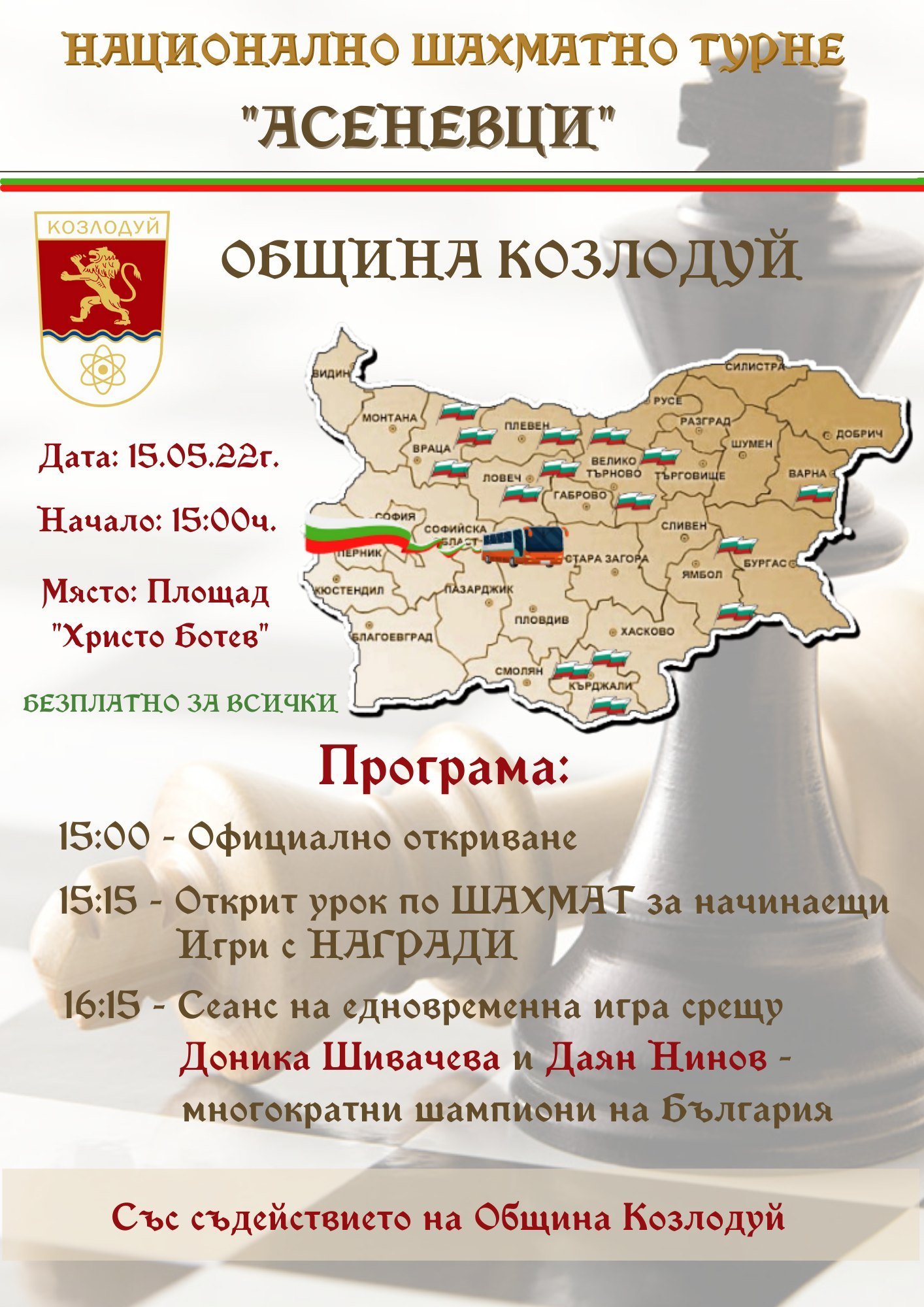 На 15 май на площад „Христо Ботев” Община Козлодуй ще бъде домакин на открит урок по шахмат, част от Национално шахматно турне „Асеневци” 2022 г., което обхваща 20 общини от цялата страна.