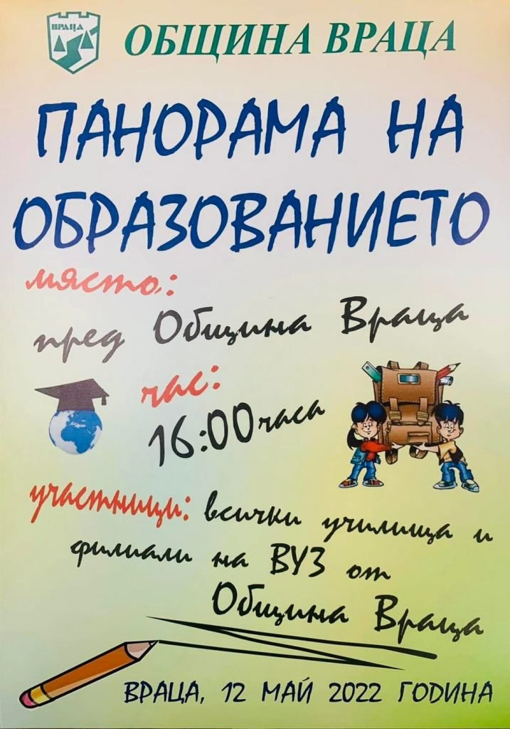 “Панорама на образованието“ ще се проведе на 12 май, от 16:00 часа, пред сградата на Община Враца.