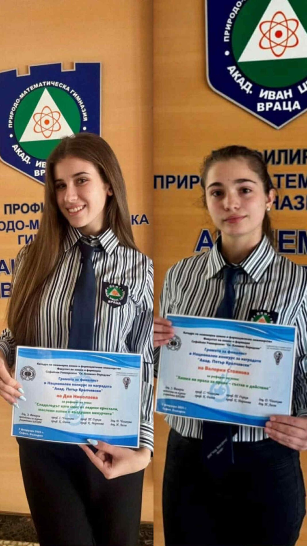 Две десетокласнички от ППМГ „Акад. Иван Ценов“ – Дея Николаева и Валерия Стоянова – се наредиха сред най-добрите млади химици в страната, след като станаха финалисти в националния конкурс „Акад. Петър Кралчевски“.