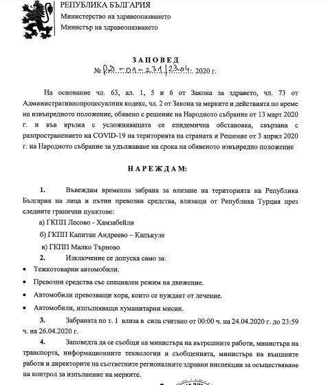 Днес, 23 април, министърът на здравеопазването издаде заповед, с която въвежда временна забрана за влизане на територията на Република България на лица и пътни превозни средства, влизащи от Република Турция през граничните контролно-пропускателни пунктове Лесово – Хамзабейли, Капитан Андреево – Капъкуле, Малко Търново.